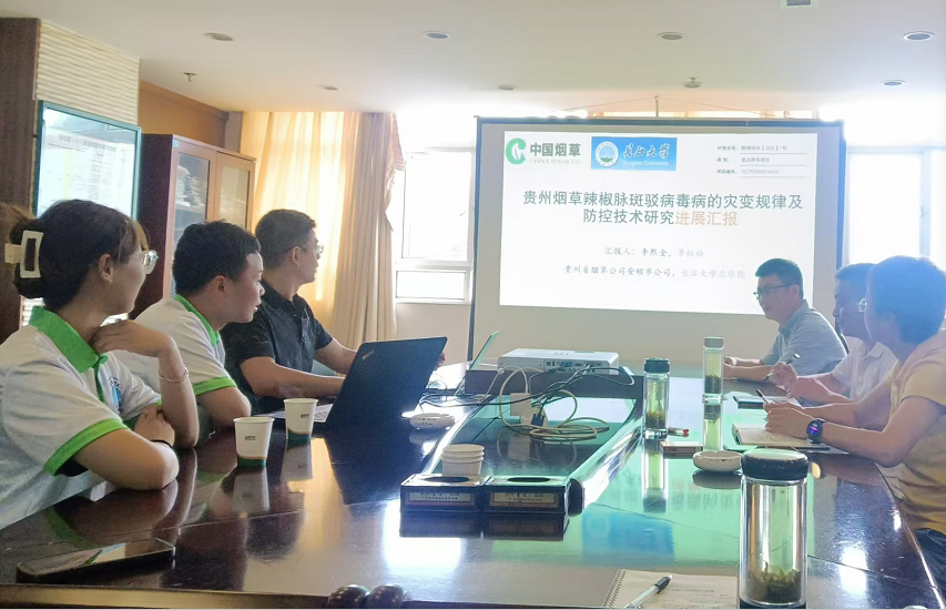 接下来队员们先后在西秀区杨武乡、双堡镇、宁谷镇,平坝区十字回族苗族乡的烟田对烟草叶片进行采样,并现场运用所学的病毒检测技术以及长江大学病毒学研究团队与安顺市烟草公司技术中心联合开发的病毒检测新产品进行了烟草花叶病毒和辣椒脉斑驳病毒的病毒检测,检测结果显示大部分烟草植株携带烟草花叶病毒以及辣椒脉斑驳病毒,这同时也印证了双方共同研发的病毒检测试纸条的灵敏度和准确度。在实地测验之后,章教授团队与相关负责人进行了正式的会议座谈,详细汇报了项目进展,正式展示包括烟草病毒检测试纸条、病毒检测卡、ELISA试剂盒等项目创新成果并汇报项目后续的工作安排。与会烟草公司相关负责人对长江大学承担的烟草科技攻关项目进展及成果表示认可,同时也提出部分例如具体落实、推广方面细节及病毒病早期预防和防治等问题的意见和建议,经过与烟草公司的洽谈,双方最终顺利达成深入合作的意愿。