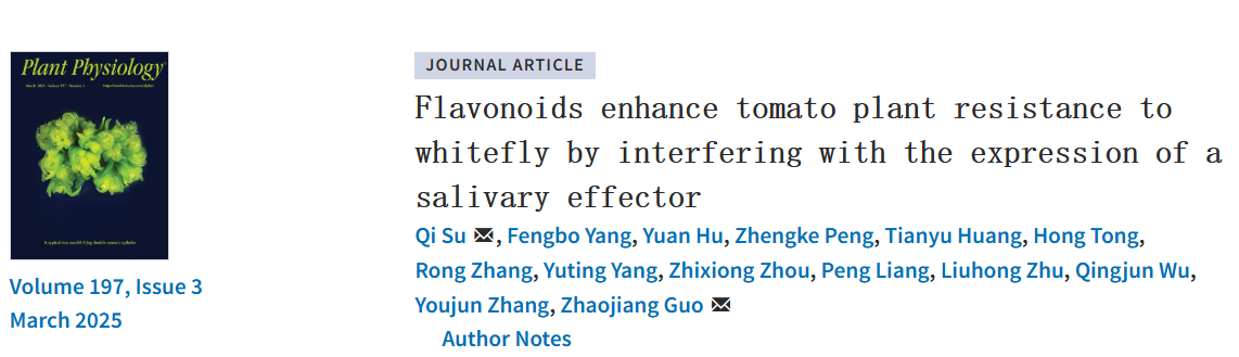 近日,三亿平台苏奇团队和中国农业科学院蔬菜花卉研究所张友军团队在Plant Physiology上发表题为Flavonoids enhance tomato plant resistance to whitefly by interfering with the expression of a salivary effector的研究论文,揭示了防御性次生代谢物类黄酮(槲皮素和芦丁)增强番茄对烟粉虱抗性的分子机制,该研究揭示了槲皮素和芦丁在番茄防御烟粉虱中的关键作用和调控机制。