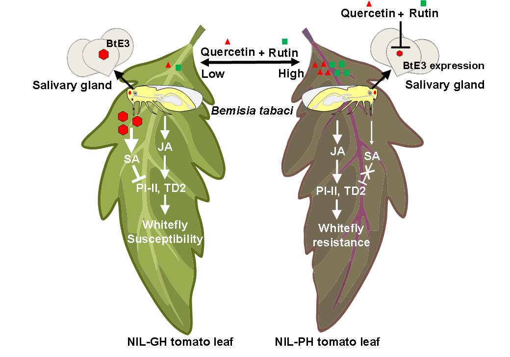 当植物面临植食性昆虫取食时,植物会通过复杂而精密的信号转导机制调控防御反应从而抑制昆虫为害。烟粉虱取食番茄植株时会分泌大量效应蛋白抑制植物防御反应从而促进其取食。苏奇课题组前期研究发现高类黄酮品系的番茄具有对烟粉虱高水平的抗性,但相关的作用机制尚不明确。在本研究中,研究团队发现取食高类黄酮品系番茄时烟粉虱的唾液效应蛋白BtE3表达量显著下调。通过构建表达BtE3 dsRNA的近等基因系番茄,发现沉默BtE3显著抑制了烟粉虱取食低类黄酮品系番茄诱导的水杨酸合成,增强了烟粉虱取食诱导的茉莉酸防御反应,从而增强了番茄对烟粉虱的抗性;与之相反,沉默BtE3并不能影响烟粉虱取食高类黄酮品系番茄诱导的防御反应和番茄对烟粉虱的抗性。此外,外源BtE3处理显著抑制了高类黄酮品系番茄的茉莉酸防御反应并增强了番茄对烟粉虱的敏感性,表明高类黄酮品系番茄可以抑制BtE3的表达从而增强对烟粉虱的抗性。进一步通过番茄回补类黄酮及人工饲料添加不同类黄酮物质,明确了槲皮素和芦丁显著抑制了烟粉虱唾液效应蛋白BtE3基因的表达。随后,通过CRISPR/Cas9基因编辑技术敲除了高类黄酮品系番茄中负责槲皮素和芦丁生物合成的Solanum lycopersicum flavonol synthase(SlFLS)基因,敲除SlFLS后,烟粉虱唾液效应蛋白BtE3的表达量显著上调,同时增强了SlFLS敲除番茄对烟粉虱的敏感性。