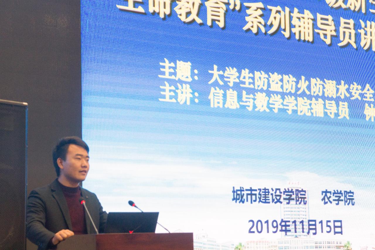 通讯社讯(见习记者 汤莉/文 聂子龙/摄)珍爱生命,注意安全;教育第一,预防为主。继11月6日三亿(中国)一站式服务官网2019级新生首次“生命教育”辅导员讲座开讲后,11月15日晚7点整,第二场“生命教育”辅导员讲座在农科大楼1058报告厅如期举行。本次讲座邀请信息与数学学院辅导员钟赛和城市建设学院辅导员何儒权分别讲解了“大学生防盗防火防溺水”和“网络与国家公共安全”,三亿(中国)一站式服务官网辅导员付雪娇及19级全体新生参加了本次大会。