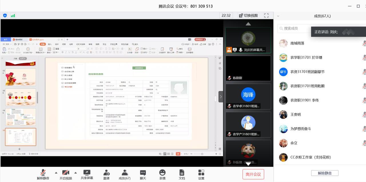 通讯社讯(学生记者 张毅)为进一步推进我院学生征兵政策宣传工作,帮助学生了解、掌握应征入伍相关政策和流程,5月29日19:00,我院通过“腾讯会议”平台开展了线上征兵政策宣讲活动。此次宣讲会由学工办主任刘庆主讲,本科班各班长、团副、今年报名应征和有入伍意愿的学生共同参与了此次宣讲会。