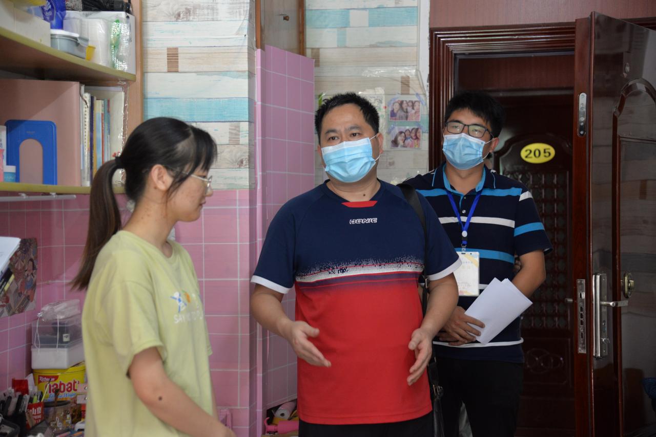 走访过程中,院领导首先对学生返校后的身体状况给予了亲切的问候和关心,并督促学生,要求每人准备一支水银体温计,并教会学生如何正确使用体温计测体温,一旦发现体温异常,要第一时间向分管年级辅导员报告。另外,老师们针对学生返校后的住宿安全问题重点强调,提醒同学们“禁止在宿舍抽烟”、“禁止使用大功率电器”、“不乱接电线”等。随后,老师们对各寝室学生们的学习和生活情况进行了交流,叮嘱同学们要保证寝室及个人的清洁卫生,疫情还未结束,人人都要警惕,保障自己的健康,共同营造一个健康安全舒适的宿舍环境。