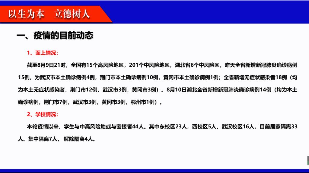 8月3日,全体辅导员分年级组织学生召开了年级大会及班会,传达了学校的疫情防控政策,对全院学生如何参与疫情防控进行了指导。