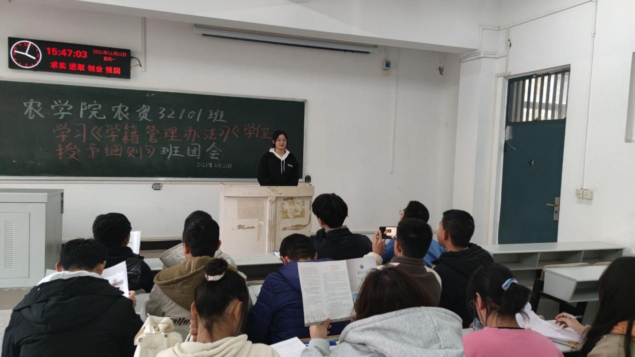 其中,农资32101班组织同学们学习长江大学关于《学籍管理办法》《学位授予细则》的官方文件,严肃认真对待学籍管理。学籍自然人属于学校的一种法律上的身份或资格。同学们表示会积极充分认识到学籍管理的重要性,对自己负责,积极配合学院工作和各项活动,做高素质人才。