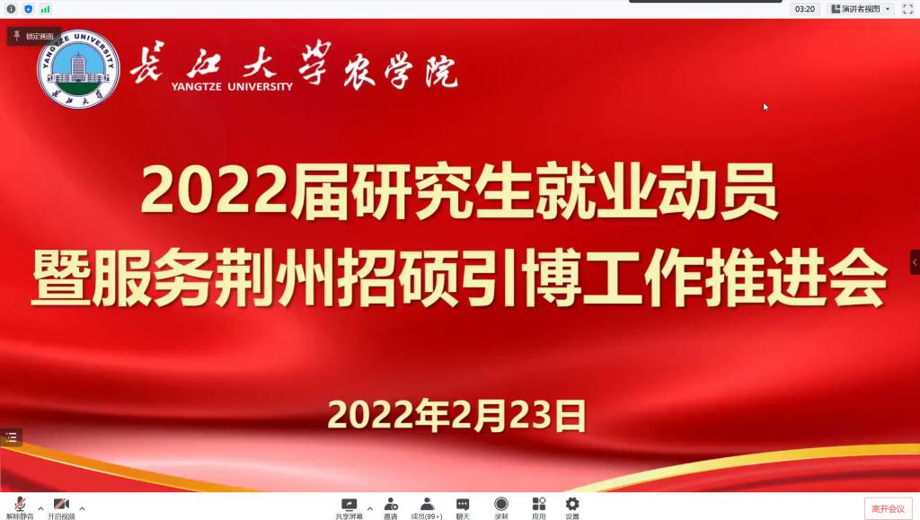 (通讯员 林香亮 陈龙艳)2月23日下午,三亿(中国)一站式服务官网召开2022届研究生就业动员暨服务荆州招硕引博工作推进会。副院长方正武、农学系书记王书平、植保系主任董小林、农资系书记陈小慧、就业专干刘庆、研究生辅导员林香亮、兼职辅导员张苗苗和全体2022届毕业研究生参会,党委副书记谭亮魁主持会议。