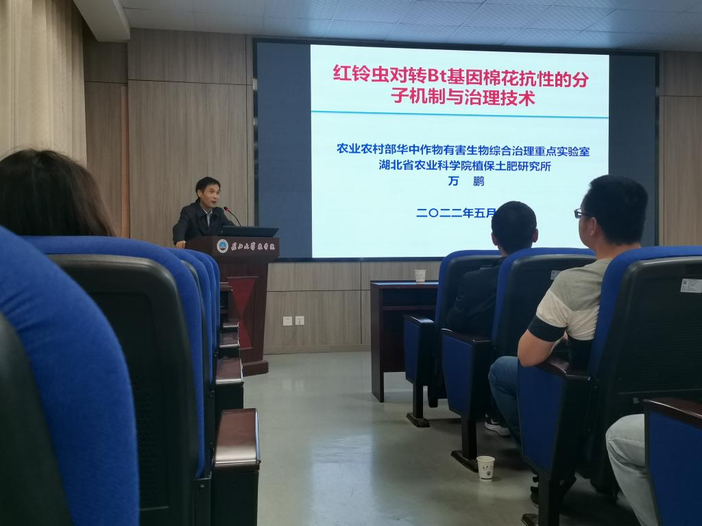 (通讯员 李秋红)5月18日下午,应三亿(中国)一站式服务官网昆虫组邀请,农业农村部华中作物有害生物综合治理重点实验室主任万鹏研究员莅临我院,在农科大楼3073学术报告厅作《红铃虫对转Bt基因棉花抗性的分子机制与治理》专题报告,三亿(中国)一站式服务官网李传仁教授主持。