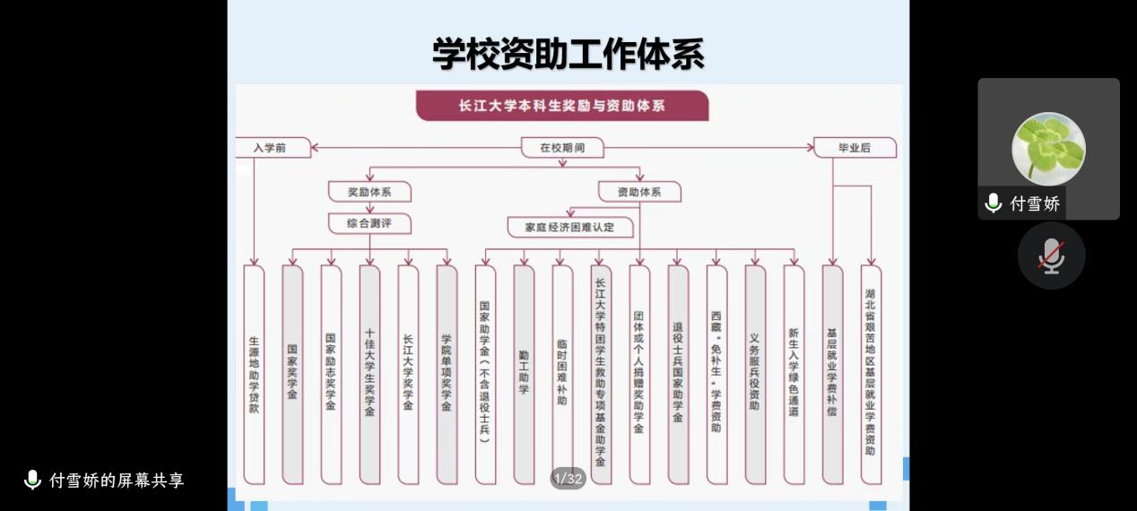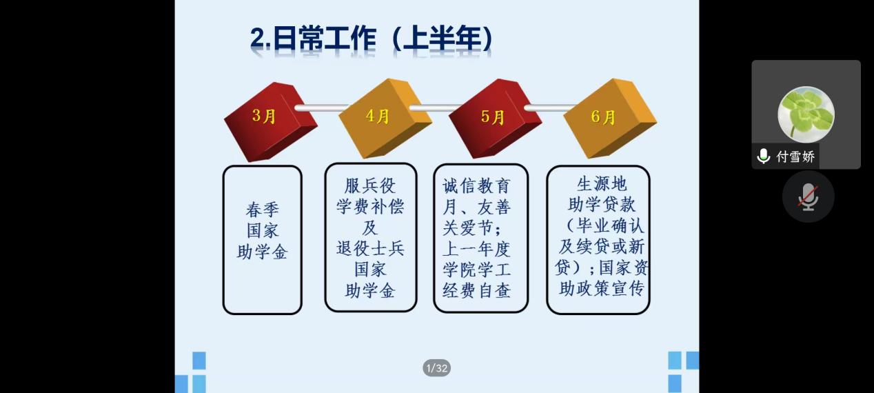 本次培训中,付雪娇老师从资助概况、资助重点、资助流程、资助要点四个方面进行了详细的讲解,对各类奖助学金的评选要求和操作流程做了详细的解释,期间并用漫画的形式对春季国家助学金进行了生动形象的描绘。除此之外,付雪娇老师还重点讲述了国家助学贷款的相关事项,强调了学生关注还款方式的重要性。