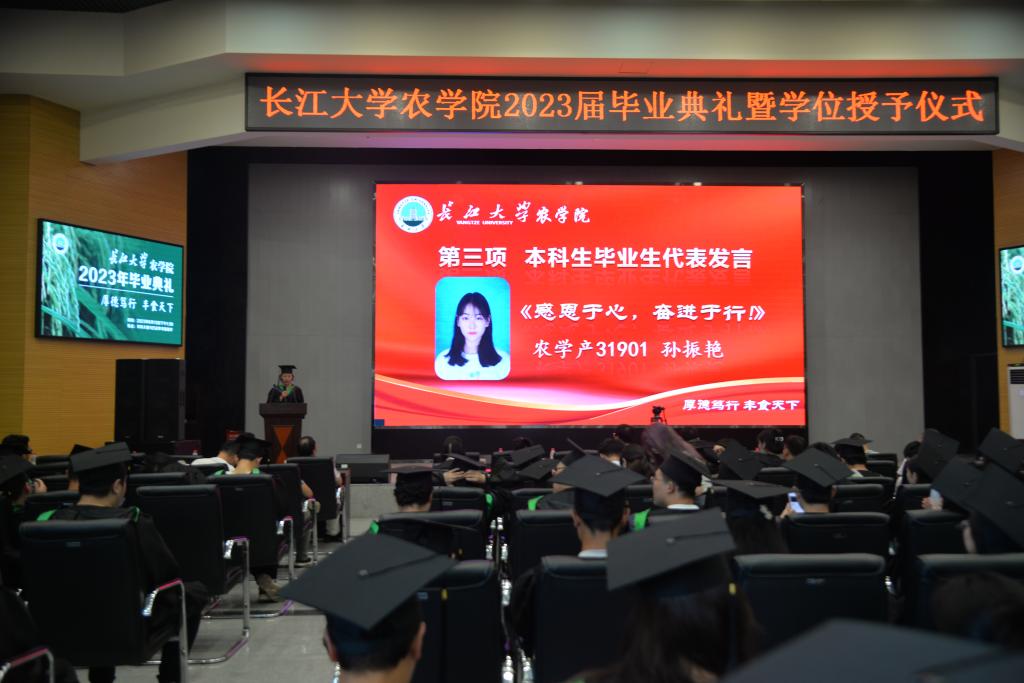 典礼随着暖场舞蹈《华夏》的表演拉开序幕,现场成员在尹书记的带领下共同奏唱国歌,2023届毕业典礼暨学位授予仪式正式开始。典礼伊始,由党委书记姜清奎为优秀毕业生代表颁奖。随后,由三名毕业生代表发言。农学产31901孙振艳作为本科毕业生代表饱含深情地做了以《感恩于心,奋进于行》为题的发言,她用真挚的言语表达出对老师的感恩、对同学的不舍以及对学院的祝福。其后,研究生毕业生代表农艺种业QZ201班杨伟与留学生毕业生代表2020级作物学Milca Banda Medison先后上台进行发言,言辞恳切地表达出对老师、同学们的感激之情以及对未来的展望。
