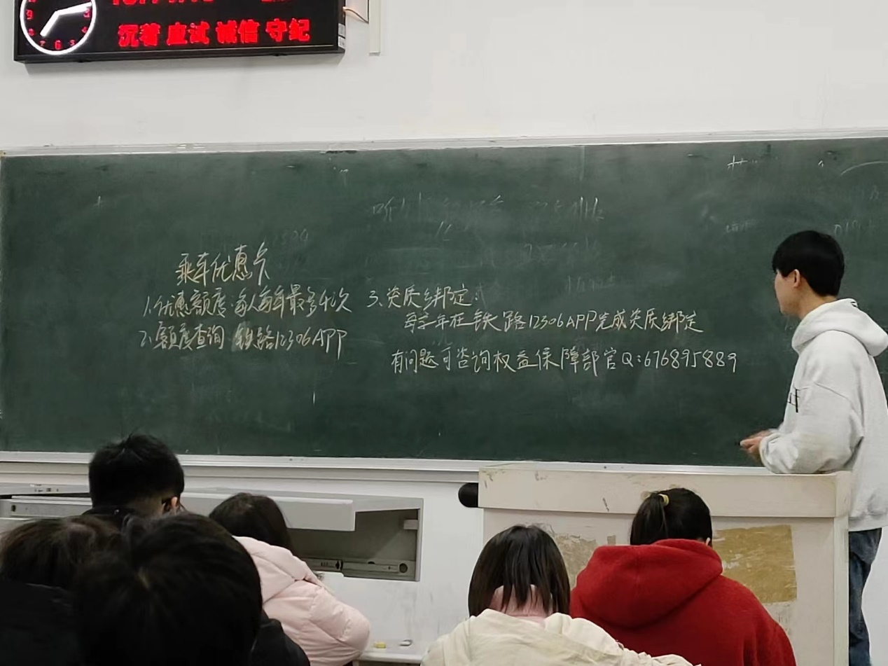 陈彦戎的介绍过后,各班同学提出了自己的疑问,三亿(中国)一站式服务官网权益保障部成员就提出的问题一一作出解答。同学们积极听取了三亿(中国)一站式服务官网权益保障部各成员的讲解,认真做好了笔记。此次培训会后,各位同学可以向未到场的同学详细讲解学生证的使用细则,讲解“学生票”优惠资质绑定细则。