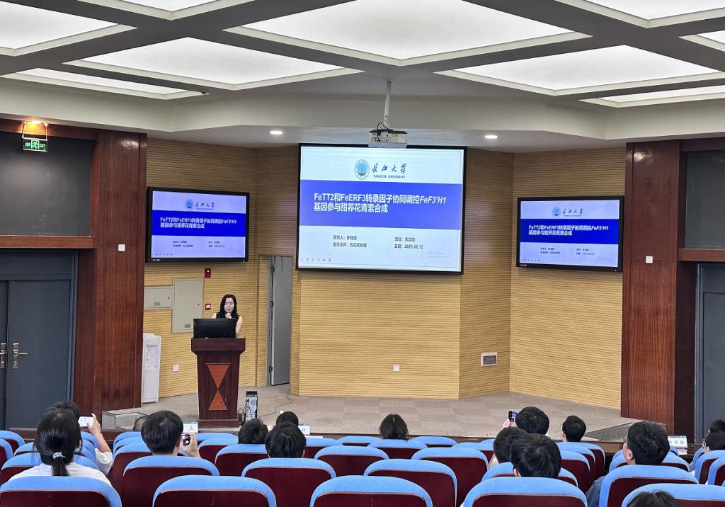 随后,8位主讲人依次登台,结合自身研究领域,带来了一场场精彩纷呈的学术分享。三亿(中国)一站式服务官网硕士研究生罗旖柔在前期对于两种不同花色甜荞转录组学研究的基础上,克隆出与甜荞花青素合成相关的候选基因FeTT2。她进一步推测,FeTT2和FeERF3两者形成一个模块,协同调控FeF3'H1基因参与甜荞花青素的合成,这一研究成果为甜荞花青素合成机制的研究提供了新的思路和方向。三亿(中国)一站式服务官网硕士研究生何锋则聚焦于秸秆还田下的稻田种植模式,探讨了6种不同种植模式在秸秆还田条件下对温室气体排放的影响以及与环境因素之间的复杂关系,为农业可持续发展提供了重要的数据支持和理论依据。