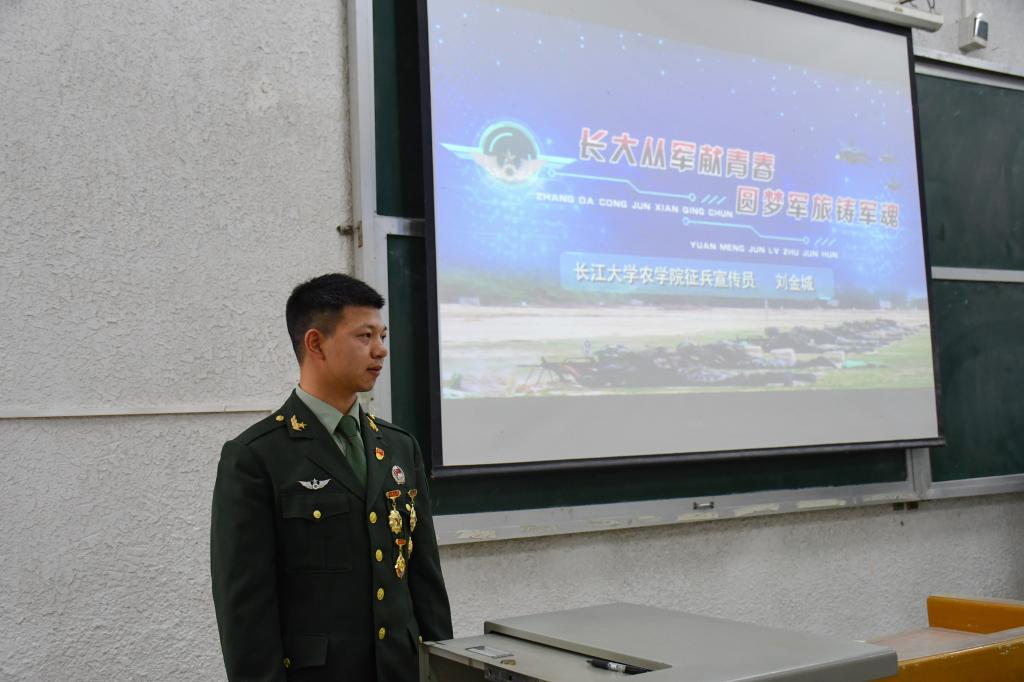 刘金城为大家详细解读了大学生参军入伍的应征条件、应征流程、优待政策、发展途径以及经济补助等政策。他以“责任、荣誉、锻炼”三个方面出发,结合自身发展历程,为大家作征兵动员报告,号召同学们携笔从戎,到军营中提升自我、施展才华、报效国家。