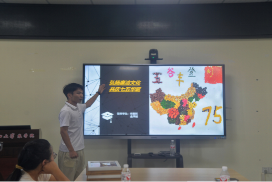 其中作品《神州葳蕤》由黑豆,红米等拼贴,中心是中国地图,上方是“五谷丰登”字样,右上方是中国国旗,右下方是数字“75”。该作品表明,七十五载春华秋实,我国农业展现五谷丰登的收获景象。农业的辉煌发展寓意着国家稳固,经济发展,人民幸福。生长在如此富足的时代,我们更应心存感恩,热爱祖国.