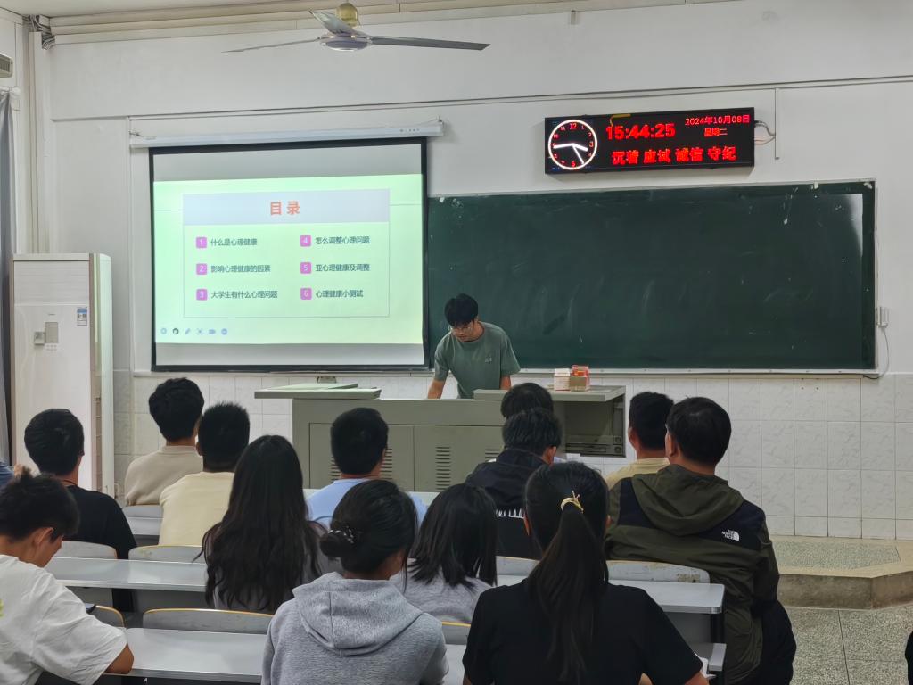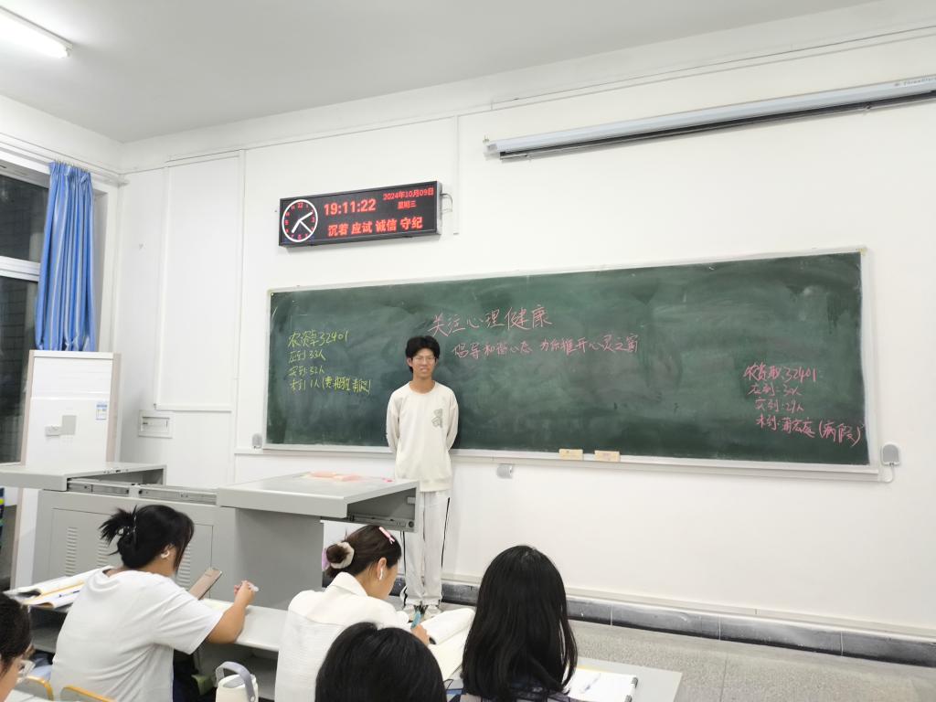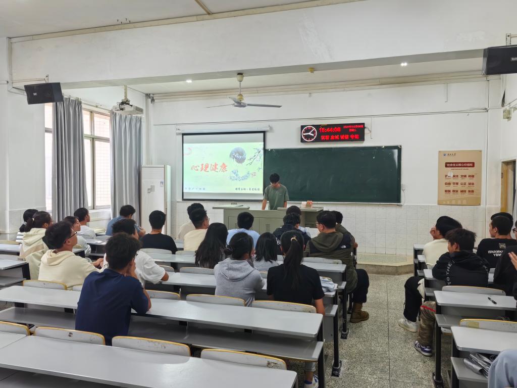班会上,心育委员向同学们强调了心理健康在大学生活中的重要性,带领同学们学习掌握心理健康相关的基本知识,包括如何识别和应对心理问题、如何调整心态以投入到今后的学习生活等。
