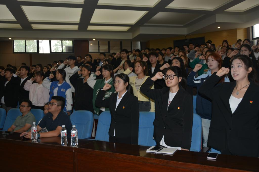 紧随其后的是学干代表臧仕骏的发言。在回顾自己加入学生会的往昔后,他鼓励新干事们要脚踏实地,认真负责。宣誓环节由主席团成员刘佳豪领誓,全体学生会成员真诚庄严的誓言回荡在会议室的上空。宣誓结束后,主席团成员宗召英为大家宣读了考核制度文件,强调了学生会采用积分量化原则。