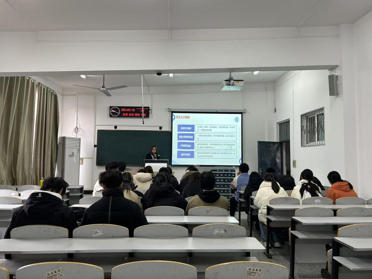 在消防安全教育活动中,学院各班级召开主题班会。老师向同学们详细讲解冬季火灾的特点、危害及预防措施,结合校园及周边环境,重点强调宿舍防火的注意事项,如禁止私拉乱接电线、不在宿舍使用大功率违规电器等,并通过图片和视频展示因电器使用不当引发火灾的案例,让同学们深刻认识到潜在的危险。随后,老师们对宿舍电器使用情况进行了细致检查,对发现的问题当场提出整改意见,督促同学们及时纠正,从源头上降低火灾风险,进一步提升学生的消防安全防范意识。