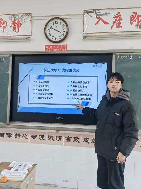 踏上久违的母校,熟悉的校园环境和亲切的老师同学瞬间勾起了陈政合高中时期的回忆。曾经,陈政合也和台下的学弟学妹们一样憧憬着大学生活,如今,他以过来人的身份站在这里,心中满是感慨,也深知自己肩负着传递希望与经验的重任。在介绍大学生活时,陈政合同学从课程设置、社团活动、社会实践等多个方面展开。陈政合详细介绍了长江大学独特的专业课程体系和丰富多彩的社团活动。在互动环节,同学们积极提问,问题涵盖了分数线、学习方法、大学专业选择以及食堂校园餐饮等多个方面。他都耐心地一一解答,与他们进行了深入的交流。展望未来,他希望能有更多的机会参与这样的活动,将更多关于大学的信息和正能量传递给更多的高中生。陈政合相信,只要我们每个人都贡献自己的一份力量,就能帮助更多的同学实现自己的大学梦,为社会培养更多优秀的人才。