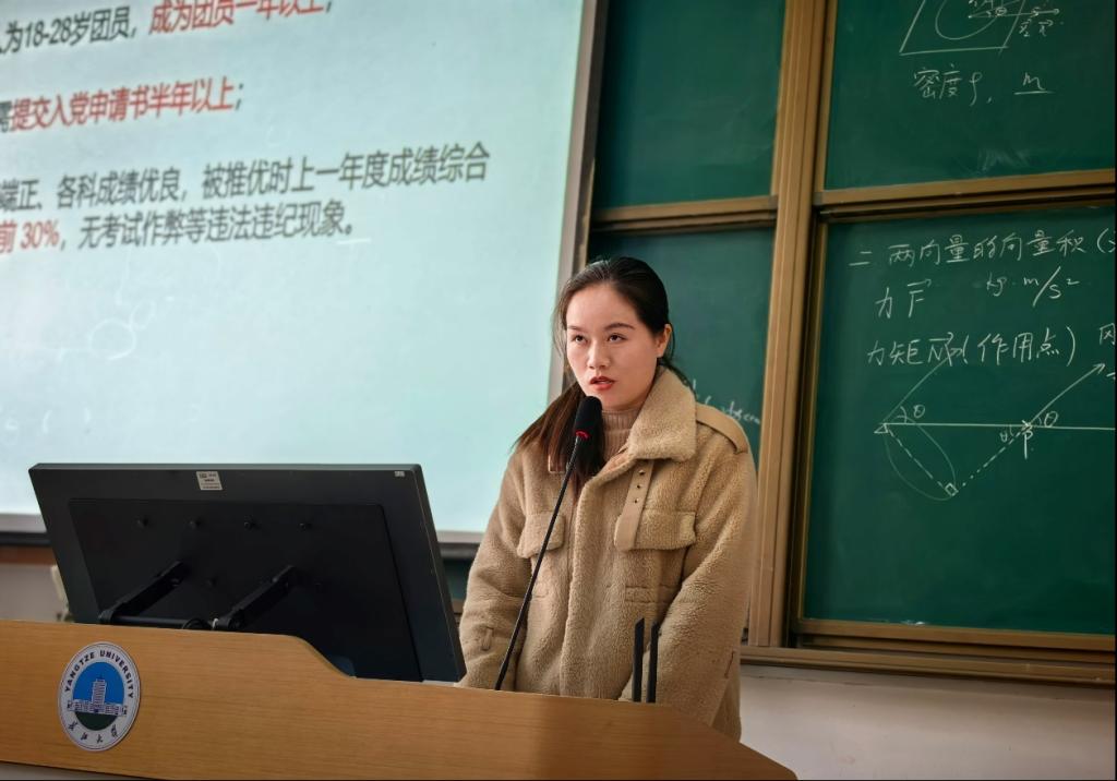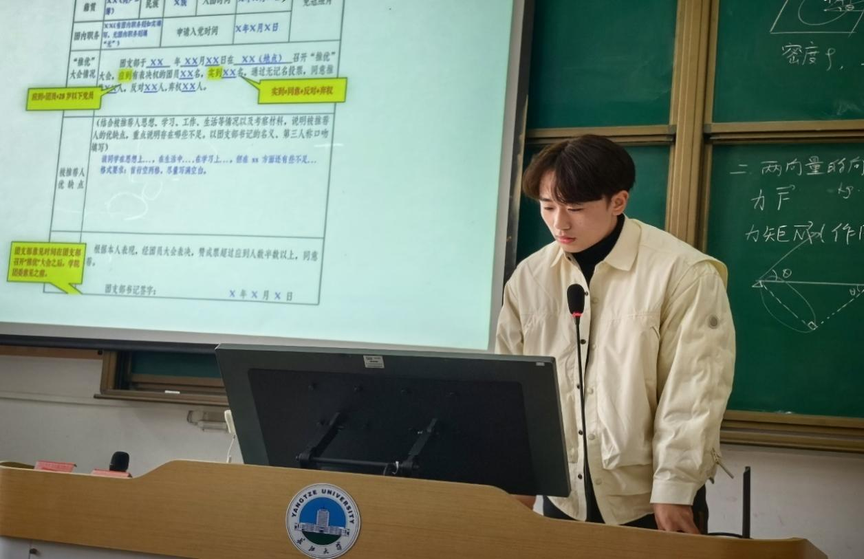 在付雪娇老师的讲解后,组织部部长蒋云霖为参会人员补充讲解了共青团长江大学委员会推荐入党积极分子申请表的填写注意事项。他强调,申请表要如实填写,重点突出个人事迹,切忌夸大其词。同时,申请人还需要提供相关证明材料,如获奖证书、社会实践证明等,以佐证自己的先进事迹。