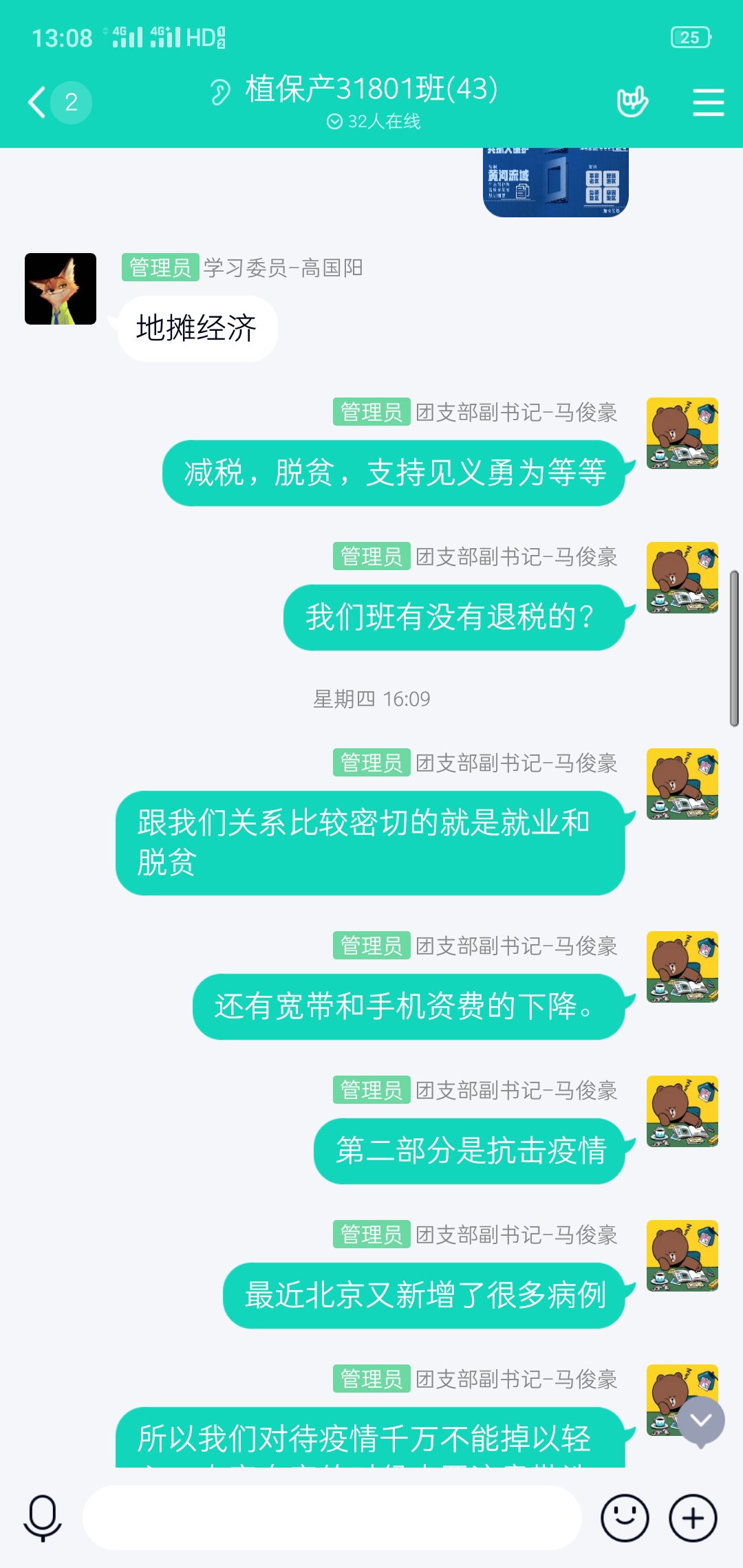 植保产31801班积极参与本次团日活动,在新闻稿中提到:“本次团会主要介绍了两会的政策:扩大农村地区招生规模,对中小企业减税降费,增加就业岗位……”会议期间,团支部副书记马俊豪同学主要向同学们介绍了2020两会的背景与主要内容,共同观看新闻联播和最近几日北京疫情的严峻形势,且副团书记联系关于反腐倡廉等相关话题引导同学们,思考自己应该树立金钱观价值观与人生观。仔细思考是什么因素导致那么多官员走入歧途并讨论如何才能制止此类事件的发生会议。最后团副总结团会的主要内容,告知同学们在家安心学习,注重个人卫生,为复学做好准备,同时也要做好规划,寻找合理实际提升个人能力。