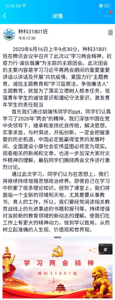 新闻网讯(通讯员 胡洋)为深入学习热议两会精神,引导学生关注两会,学习习近平再两会期间的重要重要讲话以讲话,我院本科生各团支部于2020年6月6日至6月13日陆续开展了以“学习两会精神,抗疫力行·诚信倡廉”为主题的团会活动。