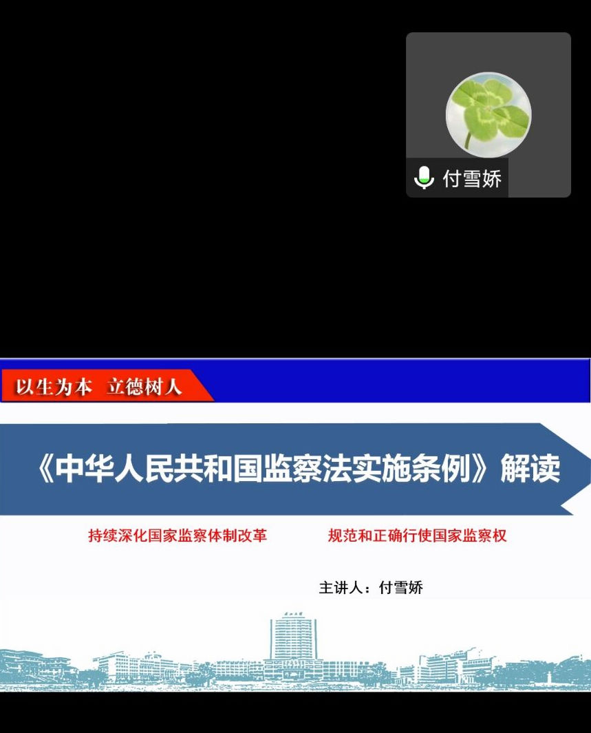 (通讯员 李雨珈)为推进全面从严治党,加强普法教育,9月27日下午,学院通过腾讯会议开展《中华人民共和国监察法》和《中华人民共和国公职人员政务处分法》学习活动。