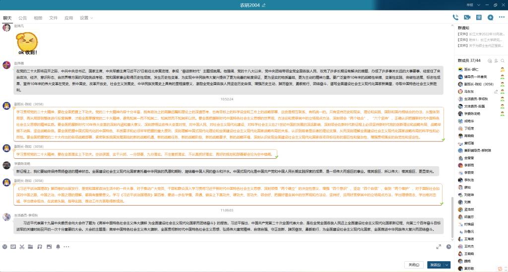 农研2004班陈龙艳分享,全面建设社会主义现代化国家寄托着中华民族的夙愿和期盼,凝结着中国人民的奋斗和汗水。新征程上,我们要始终保持昂扬奋进的精神状态。农研2203班陈艳杰表示当前疫情情况复杂,外防输入内防反弹压力巨大,作为高校大学生,我们要认真落实学校各项疫情防控政策,克服麻痹思想,将疫情防控工作放在首位。