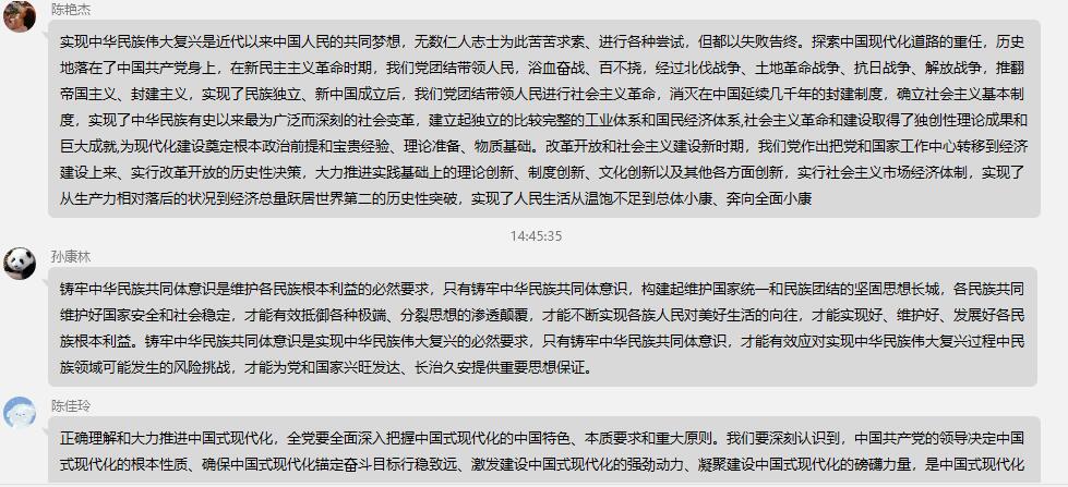 在集体讨论过程中,各团支部成员踊跃讨论交流自己的想法与收获。农研2104团支部贾艺泉表示:认真学习两会精神,争做有理想青年,我们不但要树牢正确的人生观、世界观、价值观,更要有自己的志向、追求、目标和理想,并坚持为之奋斗。农研2202团支部毛阿璐说道:“我们应珍惜今日来之不易的幸福生活,提高政治素养,紧密团结在以习近平同志为核心的党中央周围,为祖国繁荣富强更加努力学习,为中华民族伟大复兴奋斗终生!”