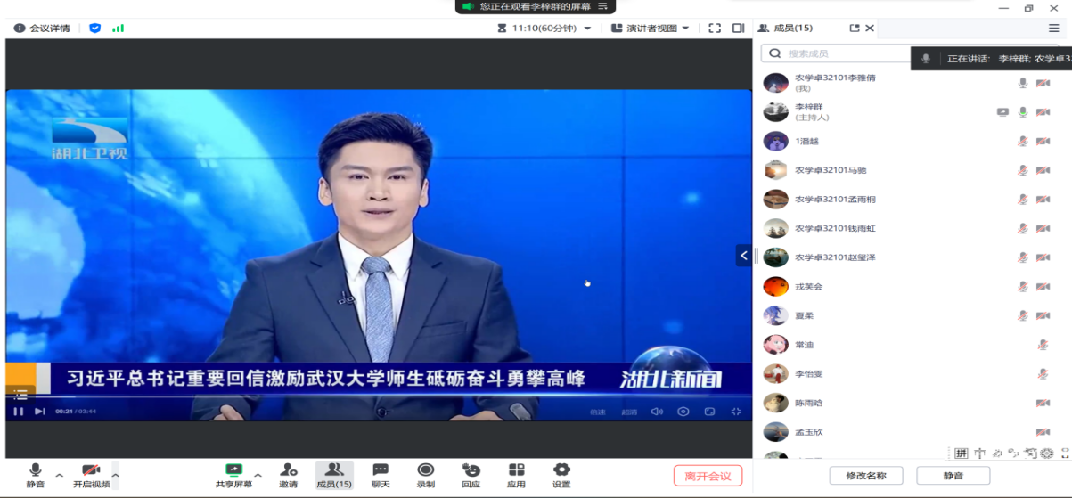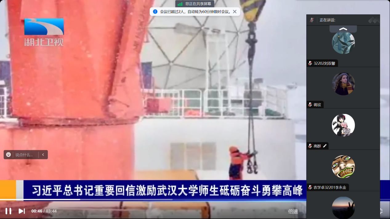 其中,各班班长告知大家要加强创新理论学习小组组织建设,规范学习制度,深入学习习近平总书记的重要回信精神。习近平总书记给武汉大学参加中国南北极科学考察队师生代表的回信中,勉励师生要用国家的大事业磨砺青年人的真本领,希望学校广大师生始终胸怀“国之大者”,砥砺奋斗,练就过硬本领,勇攀科学高峰,为实现高水平科技自立自强和建设教育强国、科技强国、人才强国和全面推进中国式现代化作出更大贡献,丰富创新理论学习的内涵,确保学习成果得以落实。
