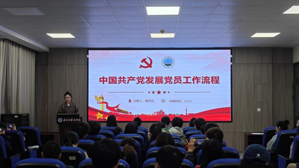 发展党员工作是一项事关党的事业兴衰成败的大事,是关系到党的战斗力和生命力的重大问题。高欣怡同学进行了入党工作流程的讲解,她从发展党员工作的重要意义引入,从申请入党、入党积极分子的确定和培养教育、发展对象的确定和考察、预备党员的接收以及预备党员的教育考察和转正5个阶段、25个步骤进行具体的介绍。听了高欣怡同学的讲解,同学们将入党的流程深深刻在了心里。