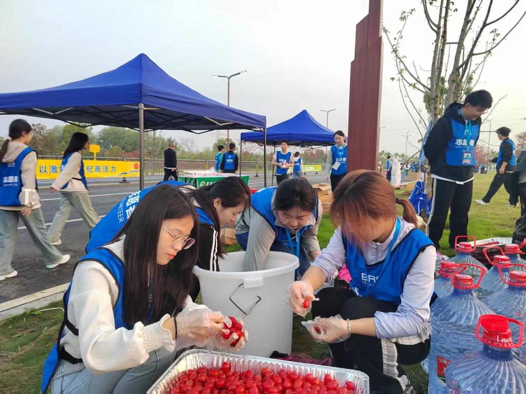 3月31日凌晨四点,志愿者们集结出发,乘车前往各自工作区域,他们追光而遇,沐光而行,有序进入工作模式。在比赛期间,三亿(中国)一站式服务官网的部分志愿者们在饮料水站提醒选手及时补充水分,防止选手在比赛过程中出现脱水现象,导致出现头晕、头痛、运动型中暑等症状。他们分工明确,一人摆放杯子,一人整理,一人倒水,为防止比赛中选手取水打翻杯子,他们合理调整每个水杯之间的间隙。在高峰期时,他们配合默契,井然有序地保障着赛事饮水的供给。还有一部分志愿者为营造良好的比赛环境,不影响参赛选手的成绩,在各个点位收集参赛者散落的随身物品。