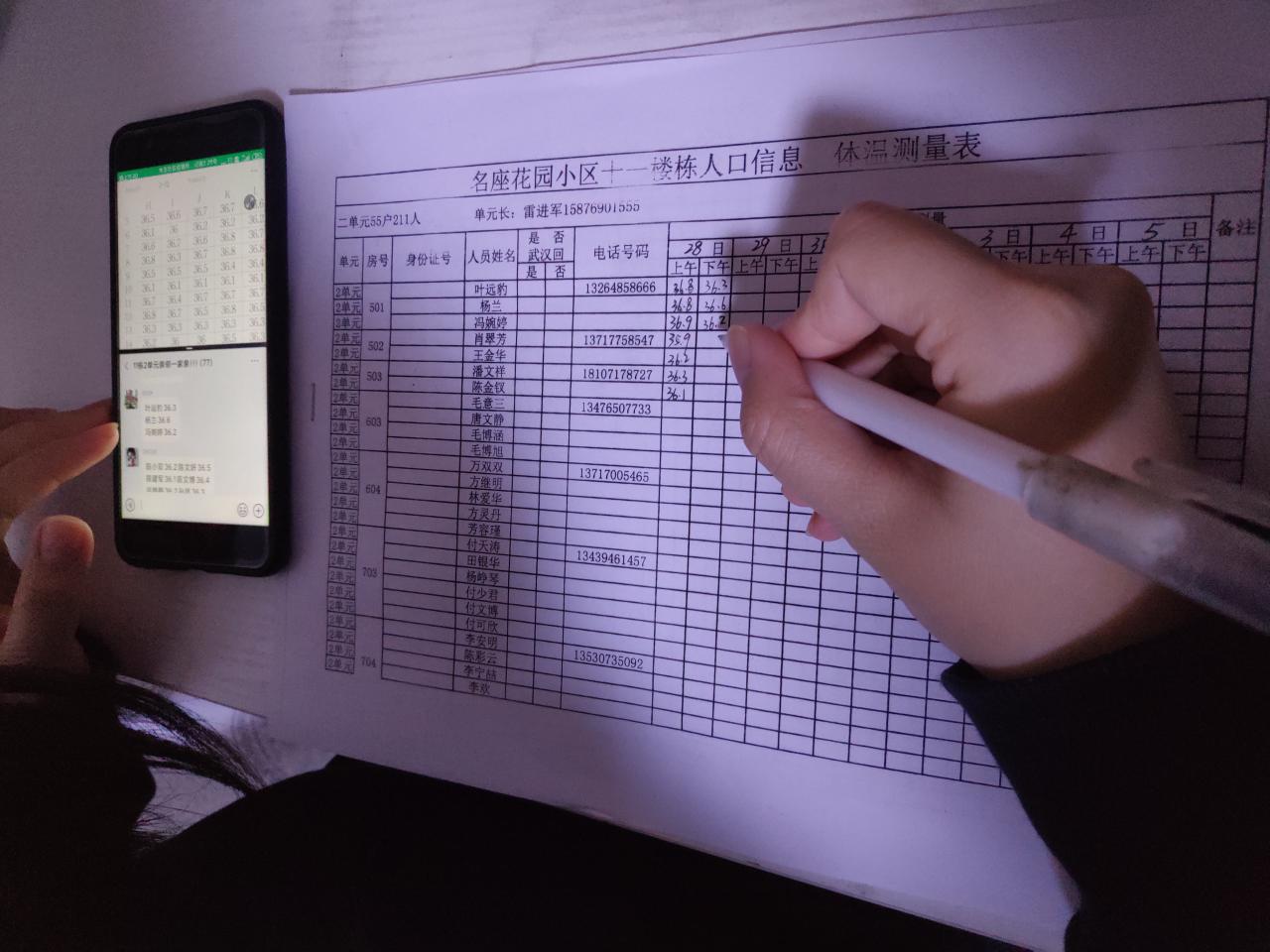 在工作中,她秉承“奉献、友爱、互助、进步”的志愿者精神为居民服务。线上,她是亲切温柔的调查人员,在微信群中统计居民体温,制成电子表格发给社区存档,为居民日后出行提供有力保障。线下,她是勇敢坚定的冲锋战士,对那些无法线上汇报体温的居民,她协助小区楼栋长上门排查人员信息、测量体温,为居民分发生活用品和蔬菜,帮助居民开通行证,为老年人送去爱心菜等。