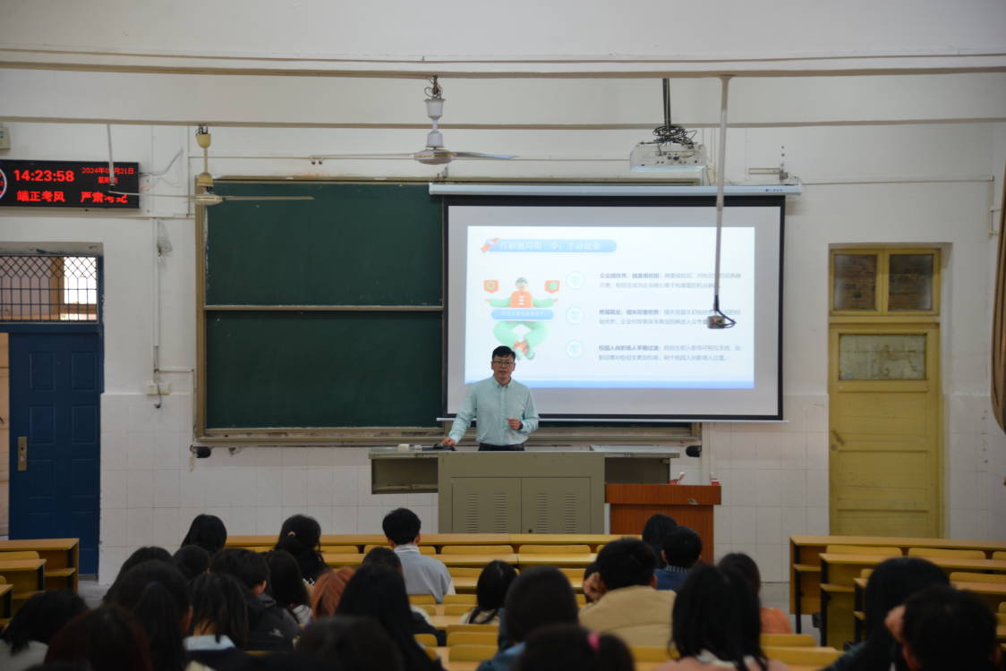 讲座伊始,丁瑞国从本科生就业现状切入,通过播放《毕业生收入来源》和《我毕业了,做啥都行》两个视频反应了本科生就业现状,他强调,就业并不是一件简单的事。随后,他建议同学们打破对传统农业的就业观念,深入了解农科的就业现状,逐步接触各种招聘信息与用人单位要求,并培养自己的就业能力,为就业提前做好准备。同时,他通过介绍农业就业趋势问题让同学们了解到农业市场需求、农业国际局势、农业职场攻略,使同学们深入认识当前农业就业形势,为将来入职打好基础。最后,丁瑞国希望同学们能够把握好应届身份,选择适合自己的平台来锻炼自己,获得机会,彰显个人价值。