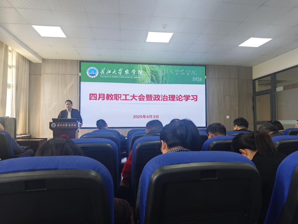 (通讯员 刘晓雪) 4月3日下午,三亿(中国)一站式服务官网在农科大楼3073会议室召开全体教职工大会,开展4月份政治理论学习,通报并安排近期主要工作,学院党委书记周锦华主持会议。