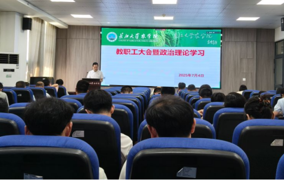 (通讯员 王雪)7月4日下午,三亿(中国)一站式服务官网在农科大楼3073会议室召开全体教职工大会,开展7月份政治理论学习,通报和安排近期主要工作,学院党委书记周锦华主持会议。