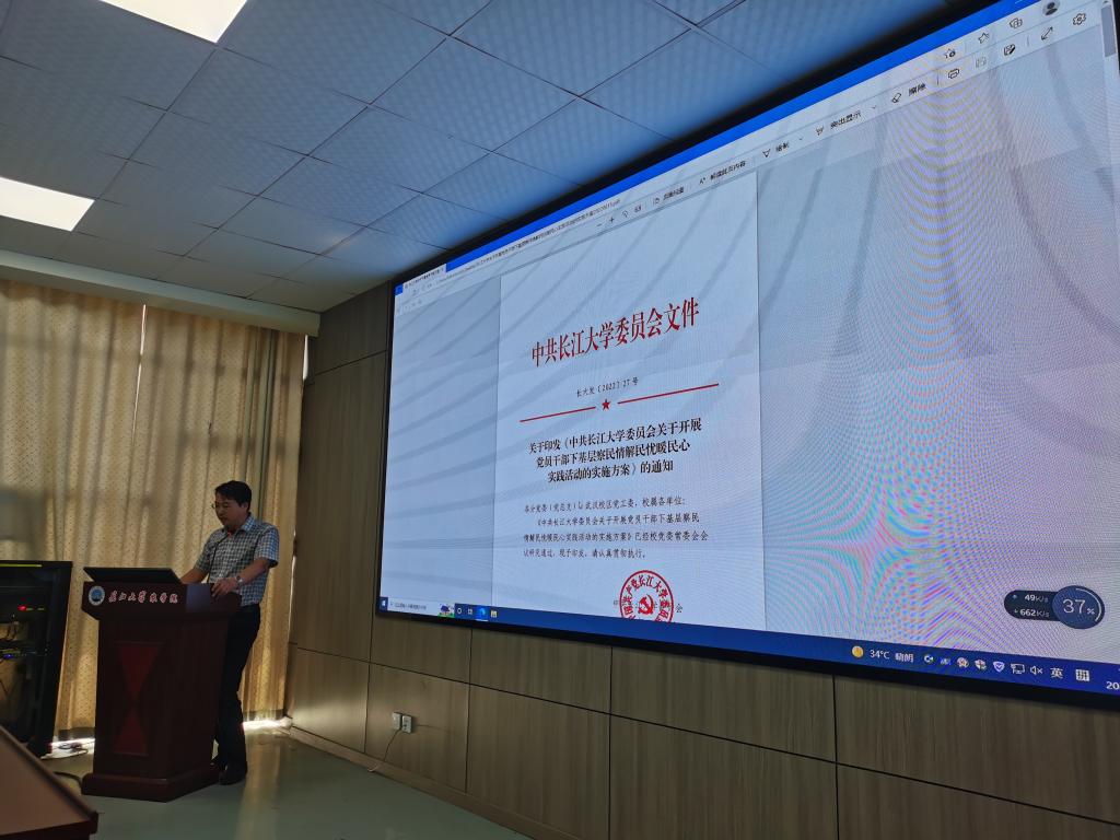 会议伊始,全体教职工集中学习了《习近平在庆祝中国共产主义青年团成立100周年大会上的讲话》、《全省党员干部下基层察民情解民忧暖民心实践活动启动》、《长江大学关于推进党史学习教育常态化长效化的实施方案及开展党员干部下基层察民情解民忧暖民心实践活动的实施方案》、《教育部关于建立健全高校师德建设长效机制的意见》、《长江大学关于领导干部插手干预重大事项记录报告的暂行规定》等内容。