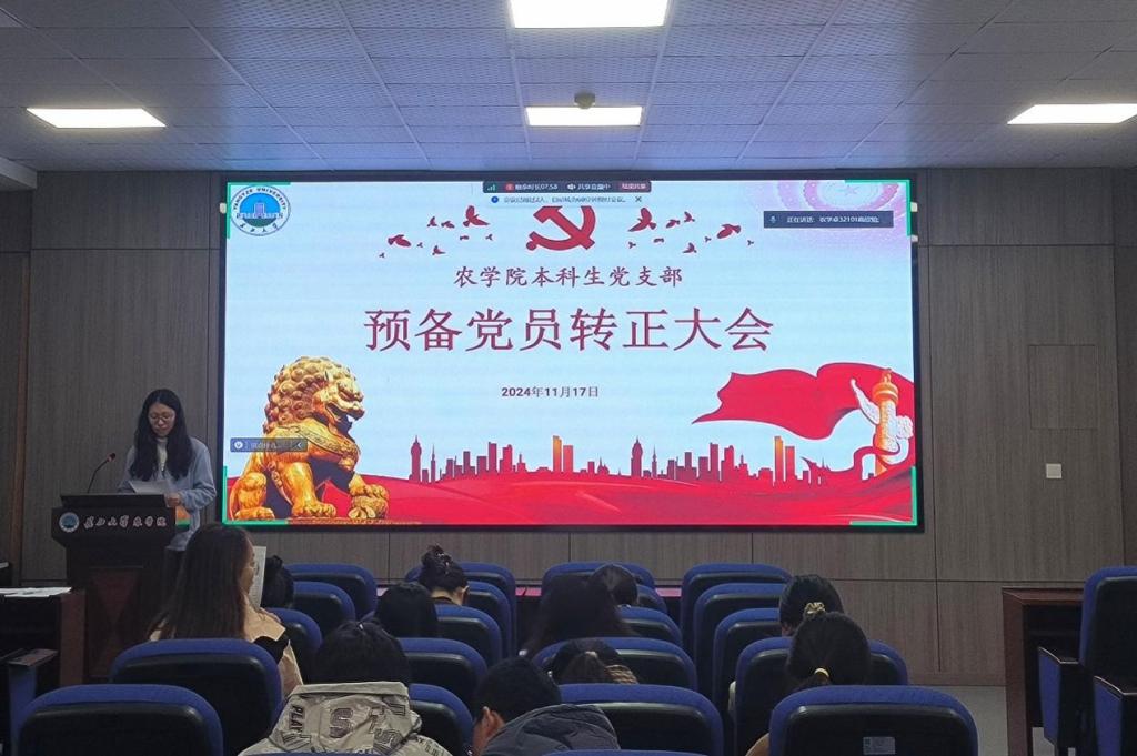 (通讯员 武芊睿)为加强党员队伍建设,进一步加强组织凝聚力,11月17日,三亿(中国)一站式服务官网本科生党支部在农科大楼3073召开2024年下半年预备党员转正大会,活动以线上线下相结合的方式开展,讨论预备党员王思宇等5名同志的转正问题。应到会党员27名,实到会20名,应到会有表决权的正式党员9人,实到会7名,超过半数,符合党员发展流程。此次会议由支部副书记高欣怡主持。