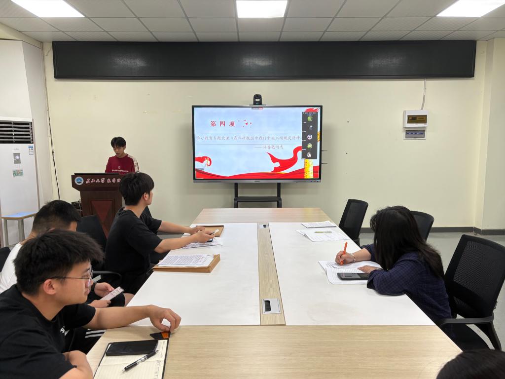 活动中,张银带领全体党员重温入党誓词,罗丽娅简要说明了本月党支部党费收缴情况。徐志鹏带领全体党员深入学习《中国共产党章程》(第六章),通过对党章的细致解读,进一步强化了党员的党性修养和组织纪律意识。支部书记林香亮以《在科研报国中践行中央八项规定精神》为题,为全体党员讲授了一堂生动且深刻的专题党课。他结合科研工作的实际,阐述了如何在科研领域中贯彻中央八项规定精神,激励党员们将个人科研追求与国家发展需求紧密结合。孙振艳带头领学了习近平给谢依特小学戍边支教西部计划志愿者服务队队员回信;彭清祥带头领学了《求是》杂志发表习近平总书记重要文章《激励新时代青年在中国式现代化建设中挺膺担当》。晏宇航、何锋结合学习工作实际,围绕“作为青年学生如何在中国式现代化建设中挺膺担当”这一主题展开研讨交流,分享思考与感悟。