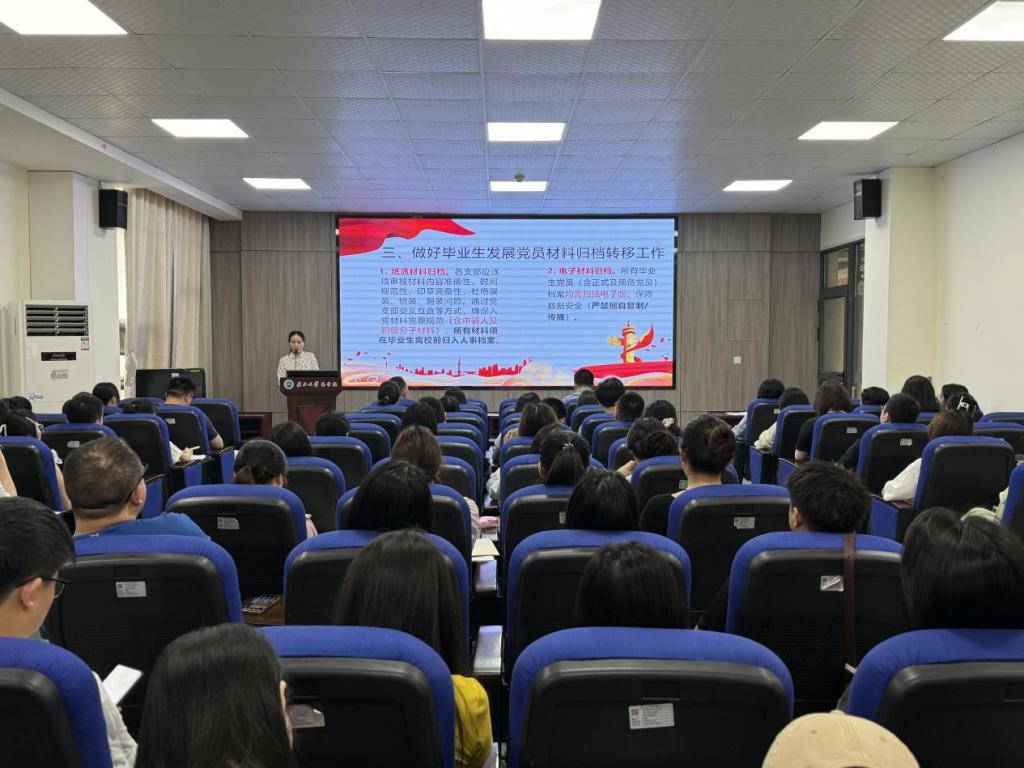 会上,付雪娇就毕业生党组织关系转接的意义以及工作要求进行了详细讲述,重点强调了毕业生党员的档案归档以及材料整理。随后,围绕毕业生党员离校前教育、党员档案材料整理、组织关系去向、组织关系转接方式、工作时间安排和注意事项等方面,结合工作经验和往届党员组织关系转接案例,进行了深入细致的讲解。