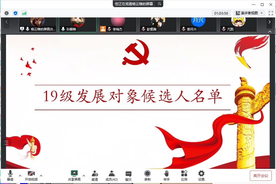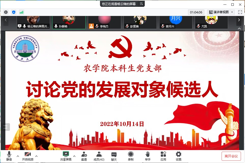 (通讯员 亢凯)为进一步加强农学院党员队伍建设,切实提高发展党员质量,10月14日上午9:00,我院本科生学生党支部在腾讯会议召开2022年下半年党的发展对象候选人讨论。活动由本科生学生党支部副书记唐海洋同志主持,本科生学生党支部书记杨云锋同志和全体本科生党员参加了讨论会。