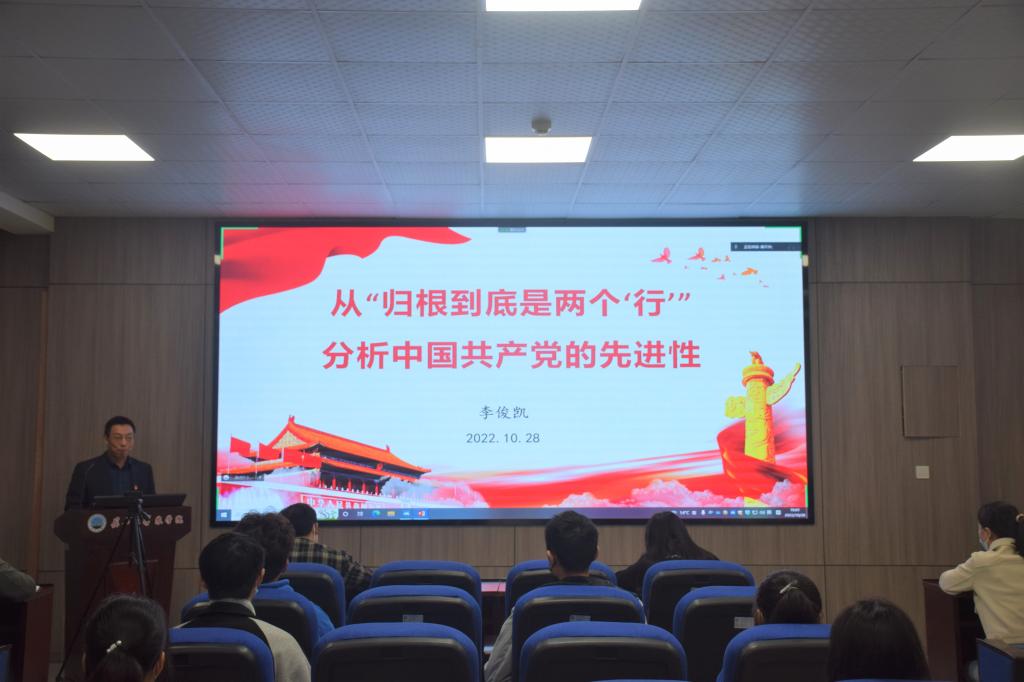 会议伊始,李俊凯院长向大家介绍党的二十大报告的五十个关键要点,其中包括“三个务必”、“三个始终”、马克思主义中国化时代化新的飞跃、中心任务等。全党同志务必不忘初心、牢记使命;务必谦虚谨慎、艰苦奋斗;务必敢于斗争、善于斗争,坚定历史自信,增强历史主动,谱写新时代中国特色社会主义更加绚丽的华章,这就是“三个务必”。在李院长生动、细心的解读下,同学们加深了对党的二十大报告的理解。