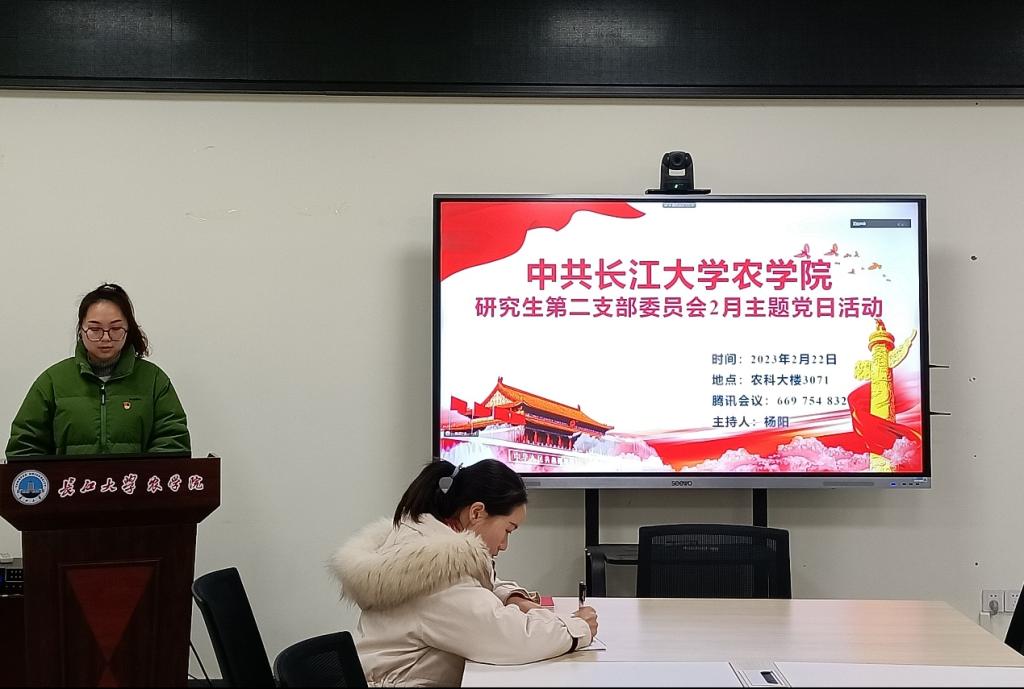 (通讯员 曹佩娜 宋梦圆)2月22日下午3点,我院研究生第二党支部在农科大楼3071开展二月份主题党日活动,活动结合腾讯会议(ID:669 754 832)的方式在线上召开。全体在校党员和校外联培党员共同参与,活动由支部副书记杨阳同志主持。