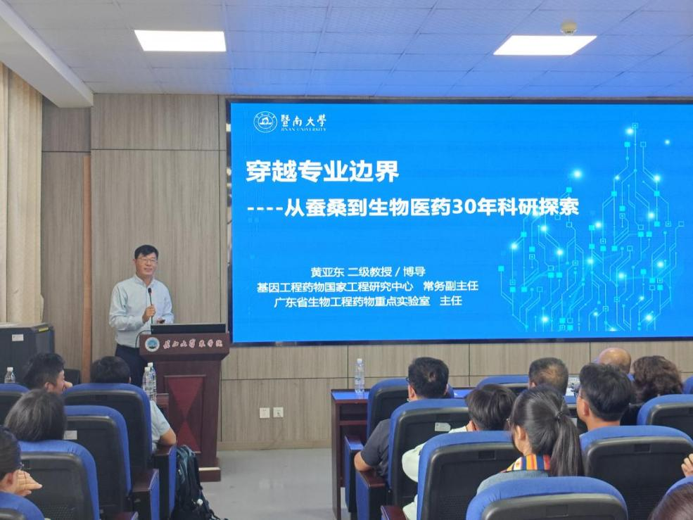经过短暂休息后,校友黄亚东,暨南大学二级教授,博士生导师,以《穿越专业边界——从蚕桑到生物医药的探索》为题,以蚕桑生物技术为起点,讲述从传统蚕桑领域向生物医药领域跨界的历程。分析基因工程与合成生物学技术在药用蛋白开发中的核心作用,阐述如何通过技术创新克服基因工程药物表达量低、半衰期短及大分子蛋白药物难以进入生物屏障等“瓶颈”问题。并以成纤维细胞生长因子和胶原蛋白为代表案例,揭示大分子蛋白在组织再生修复领域中的关键作用及其分子机制,展示相关产品的最新开发进展,为跨学科和专业的融合提供了新的思路。