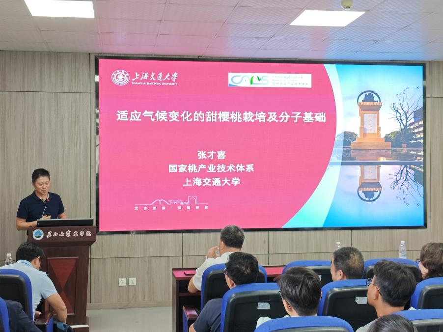 紧接着,校友张才喜,上海交通大学教授,博士生导师,带来了题为《适应气候变化的甜樱桃栽培及分子基础》的报告。甜樱桃被称为“黄金种植业",主要在渤海湾等冷凉地区生产栽培。张才喜介绍了团队通过20年来的努力,成功通过栽培技术创新和低需冷量品种育种,实现”北樱南移", 将樱桃栽培南限向南推进了910余公里的案例。这为我国樱桃的早熟栽培和周年生产奠定了坚实的基础。