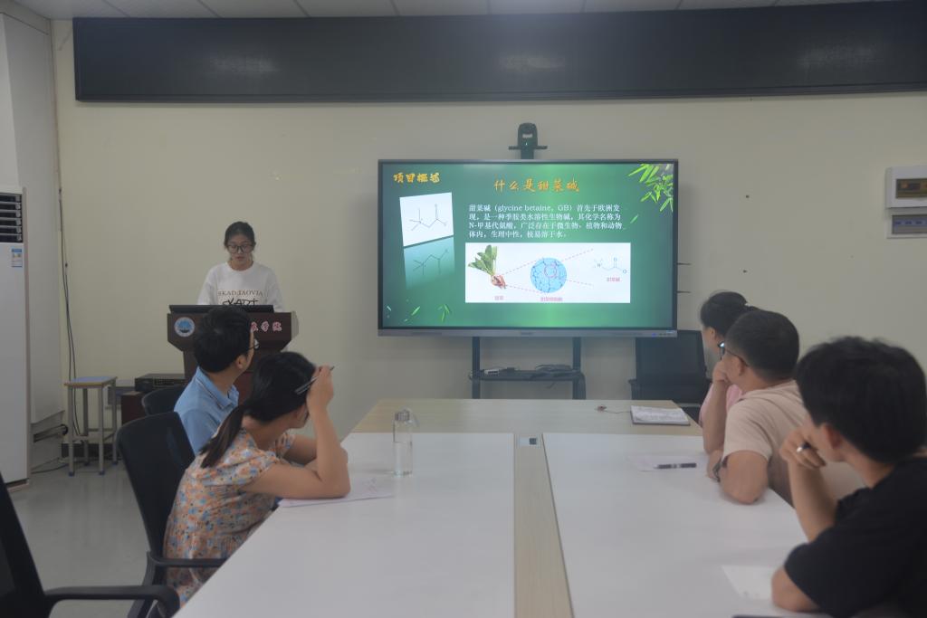 项目一团队介绍了他们的甘氨酸甜菜碱在农业中的应用研究项目,该项目旨在集数据之大成,解甜菜碱之隐忧,项目负责人以ppt汇报的形式从项目概述、应用领域、研究现状、实验数据、应用效果等方面进行汇报,在ppt演讲结束后,老师们从ppt展示逻辑、调研数据应用、创新点凸显等方面对参赛作品提出了详细修改建议。
