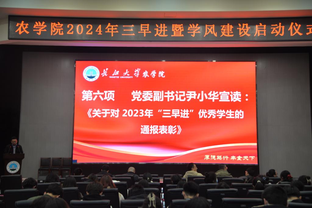仪式伊始,由23级学生代表马新玉及22级学生代表王华鉴发言,他们认为:“三早进”源于理论,行于实践。他们鼓励全体同学求真学问,练真本领,在“三早进”中找到适合自己的课题组,并从实践中来,到实践中去。随后,课题组组长代表杨伟表示,“三早进”能激发同学们的科研热情,实现同学们“农学不只是耕耘”的职业目标。农学系主任邓锋林强调,在“三早进”中,全体学生应树立目标、知行合一、勤于动手、善于动脑。接着,为表扬先进,树立榜样,党委副书记尹小华宣读颁奖文件,对在“三早进”课题活动中表现突出的学生予以鼓励。